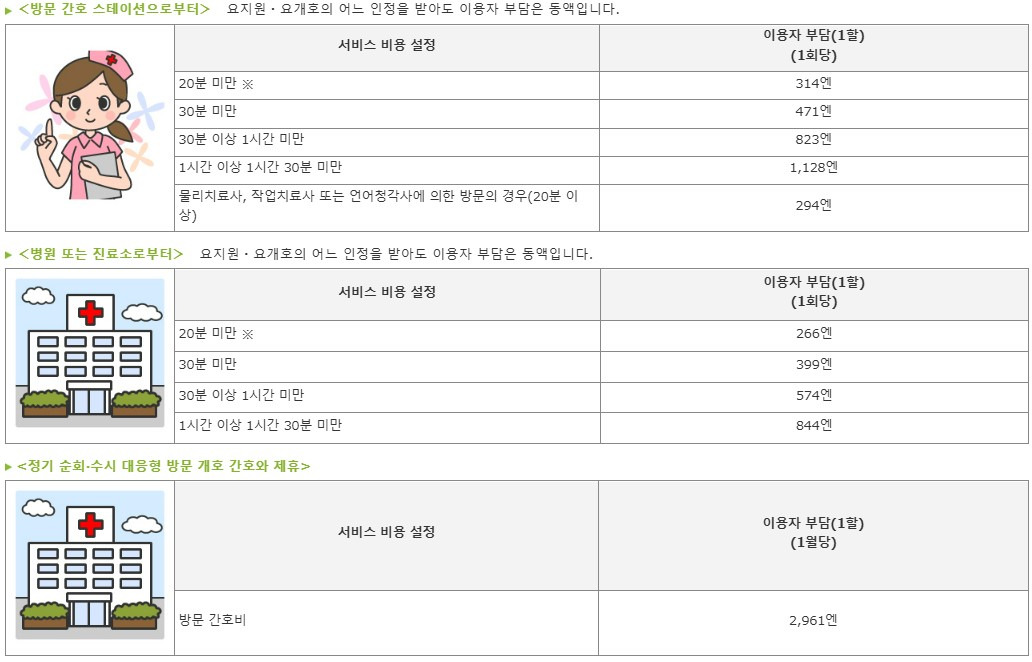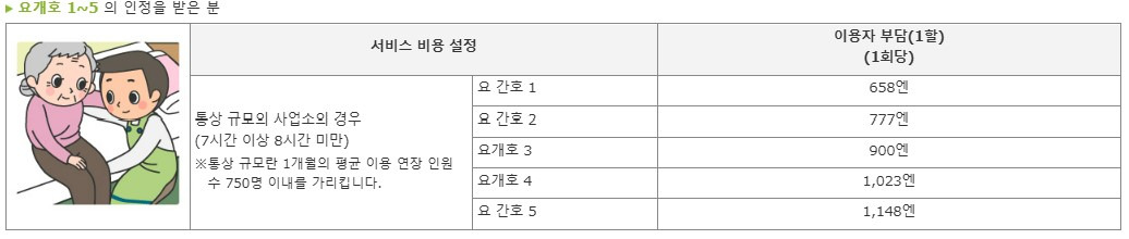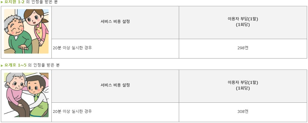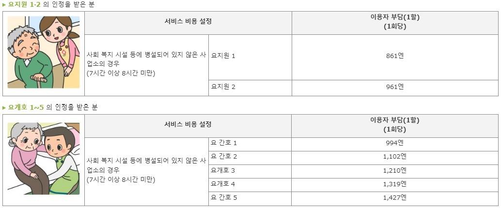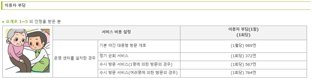 주의사항 : 정기 순회, 수시대응형 방문개호간호는 요지원1~2의 사람은 이용할 수 없습니다.